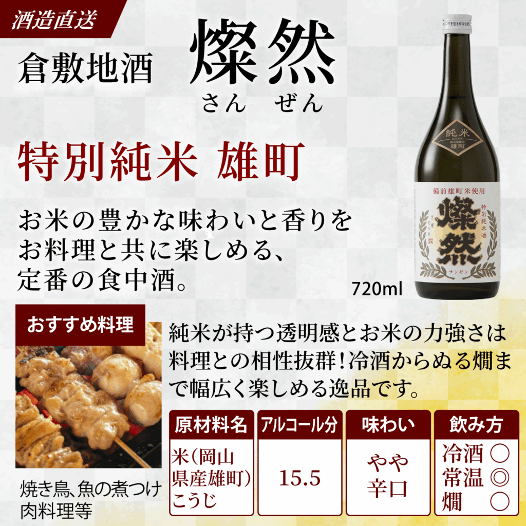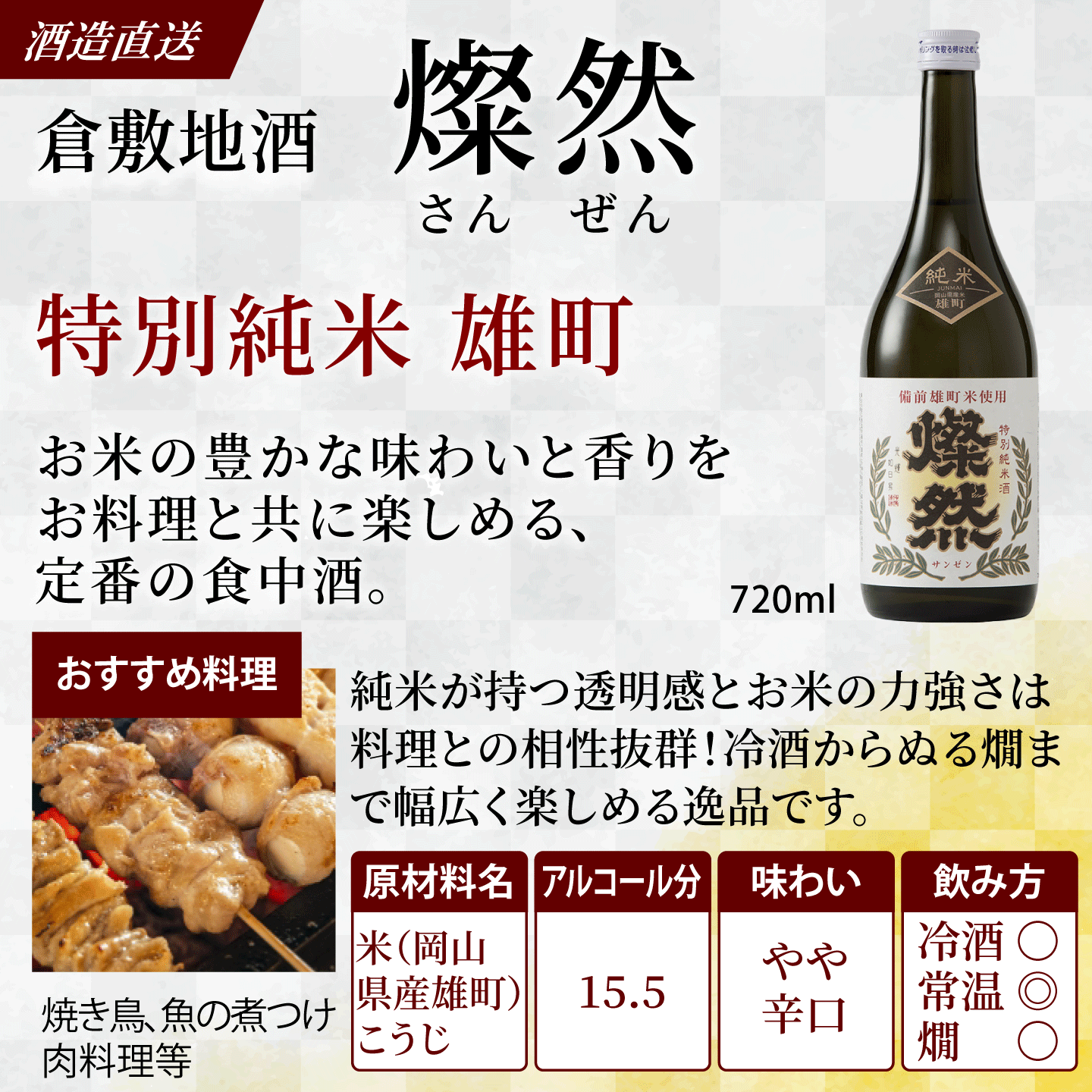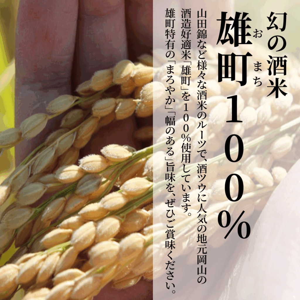 岡山が全国に誇る酒米「雄町」は、栽培も酒造りも難しいものの良酒の源となるお米です。この雄町米にこだわり、蔵元杜氏のきめ細やかな備中流の匠の酒造りの技を駆使し、雄町酒の特長である幅のあるまろやかな旨みに仕上げた、料理との相性抜群のお酒です。冷酒からぬる燗まで幅広く美味しくお楽しみいただける逸品です。